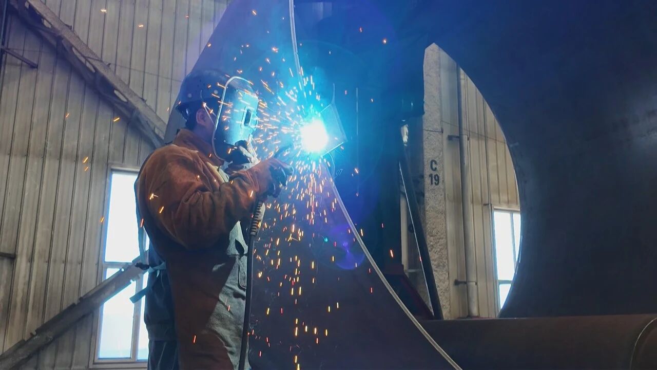 昌吉州泰胜风能风电设备有限公司生产车间内,工人正专注地进行焊接作业。王子骏 摄