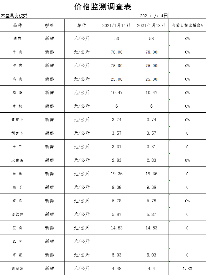木垒县2021年1月14日价格监测调查表