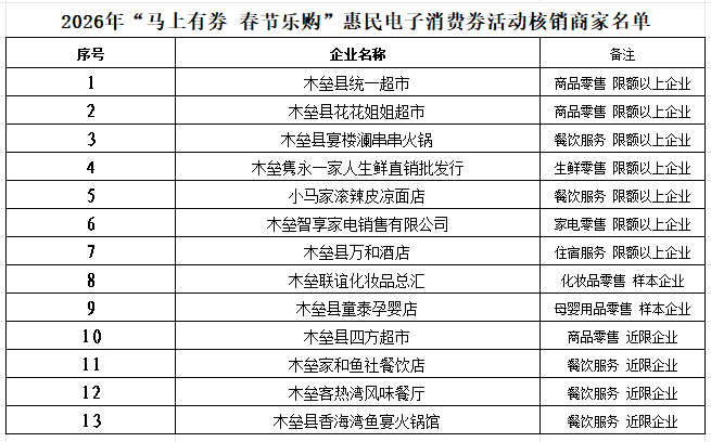 为繁荣节日市场,激发消费活力,更好满足群众美好生活需要,按照“政府补贴,商家让利,平台支持”的原则,木垒县人民政府投入百万元分批次开展2026年惠民电子消费券发放活动。在春节前启动2026年“马上有券 春节乐购”50万元消费券发放活动。